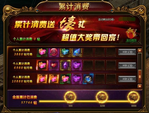 2、活动期间全服总消费每达到一定额度后,所有人均可获得一份免费大礼包。
